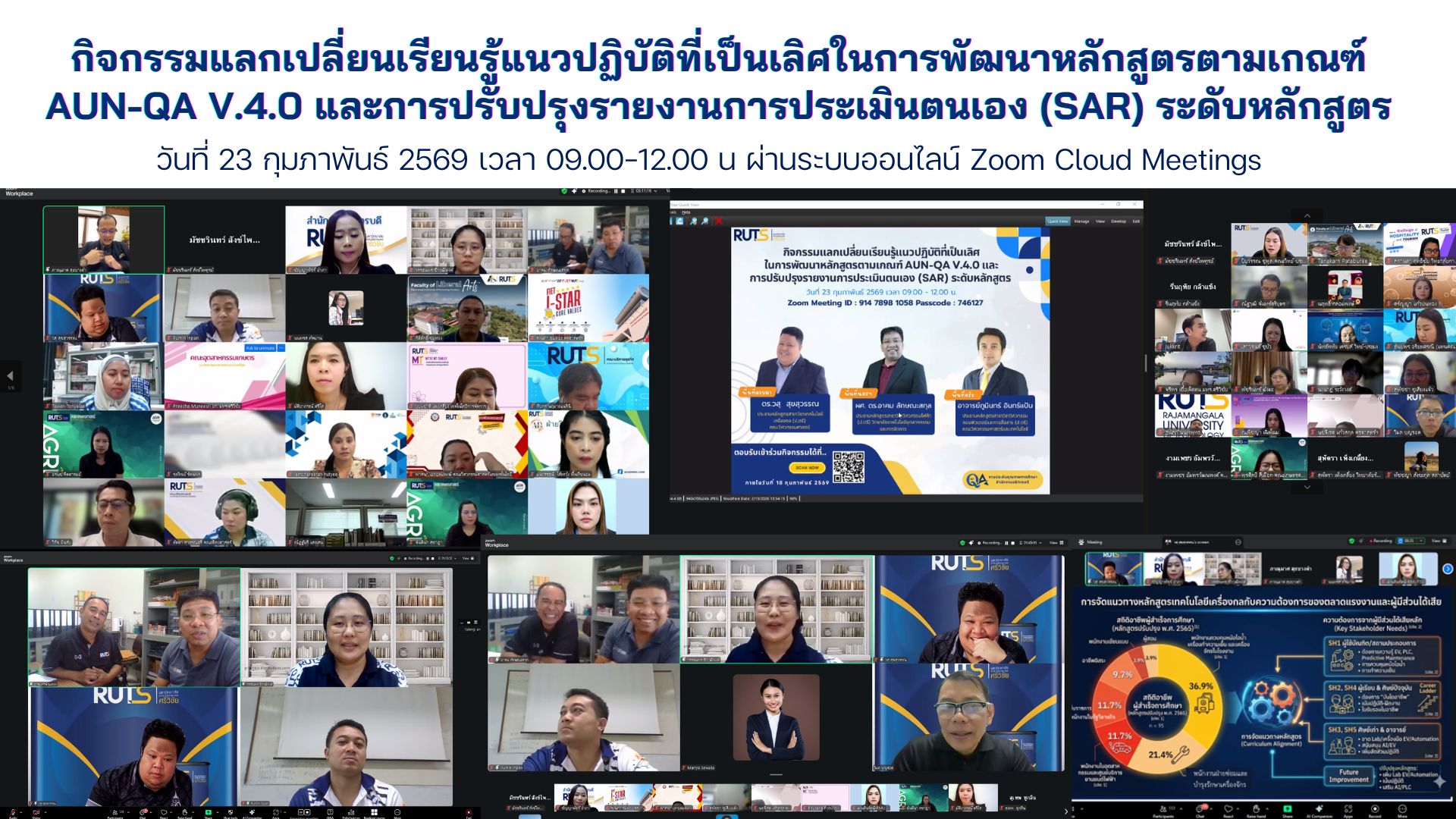 วันที่ 23 กุมภาพันธ์ 2569 งานประกันคุณภาพการศึกษา สำนักงานอธิการบดี จัดกิจกรรมแลกเปลี่ยนเรียนรู้แนวปฏิบัติที่เป็นเลิศในการพัฒนาหลักสูตรตามเกณฑ์ AUN-QA V.4.0 และการปรับปรุงรายงานการประเมินตนเอง (SAR) ระดับหลักสูตร โดยรับเกียรติจากรองอธิการบดี ดร. ภาณุมาศ สุยบางดำ รองอธิการบดี เป็นประธานในพิธี โดยในกิจกรรมมีผู้แทนแต่ละพื้นที่ร่วมนำเสนอผลงานแนวปฏิบัติที่เป็นเลิศในการพัฒนาหลักสูตรตามเกณฑ์ AUN-QA Version 4.0 ภายใต้หัวข้อ การเปลี่ยน “ความคาดหวัง” ให้เป็น “ผลลัพธ์” การจัดการเรียนการสอนที่เน้นผลลัพธ์ ระบบการวัดผลที่สะท้อนสมรรถนะ และวงจรการพัฒนาที่ยั่งยืน จำนวน 3 ท่าน คือ